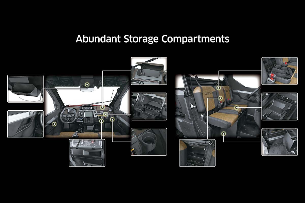 7” high-grade full-colour TFT LCD screen with speedometer, tachometer, fuel gauge, gear indicator (L, H, N, R), Driving Mode (2WD/4WD/4WD+Diff Lock), Power Mode (Work/Normal/Sport), clock, CVT temperature; selectable display that includes: digital tachometer, odometer, dual trip meters, total time, trip time, average speed, water temperature, battery voltage; Bluetooth indicator, Economical Riding Indicator, maintenance reminder (2 driver-selectable reminders), and a range of indicators and warning lamps